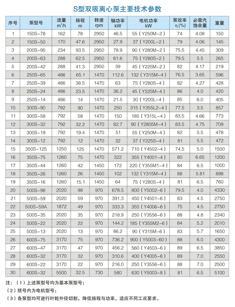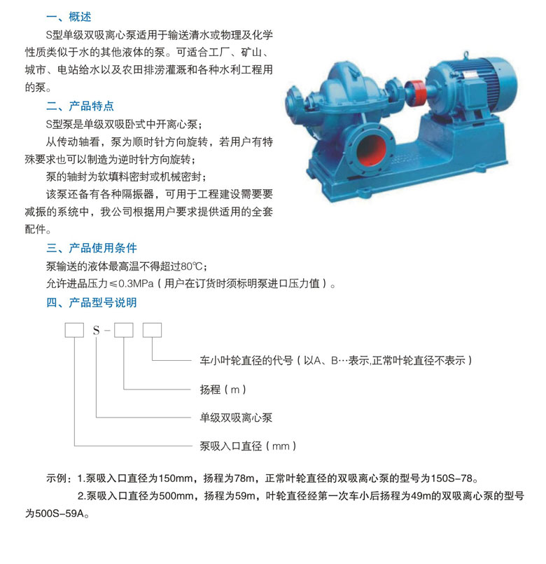 s型单级双吸离心泵适用于输送清水或物理及化学性质类似于水的其他液体的泵。可适合工厂、矿山、城市、电站给水以及农田排涝灌溉和各种水利工程用的泵。